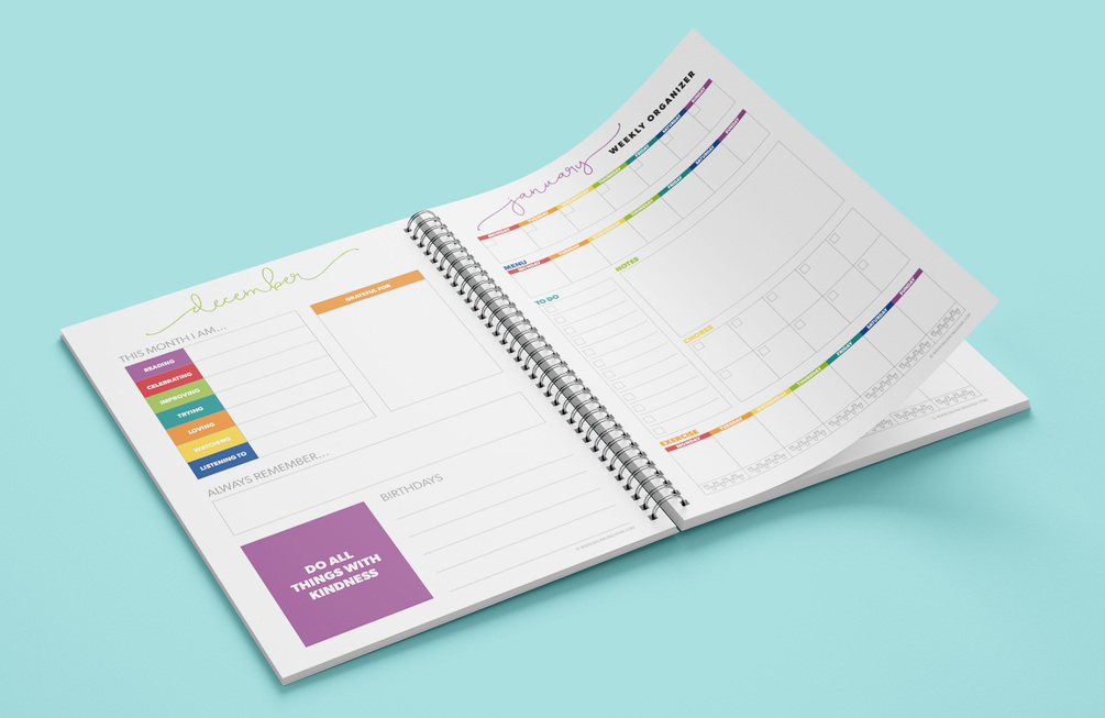 - 12 Weekly Organizer printables (undated Calendar, menu, to-do, notes, chores, exercise, hydration)
